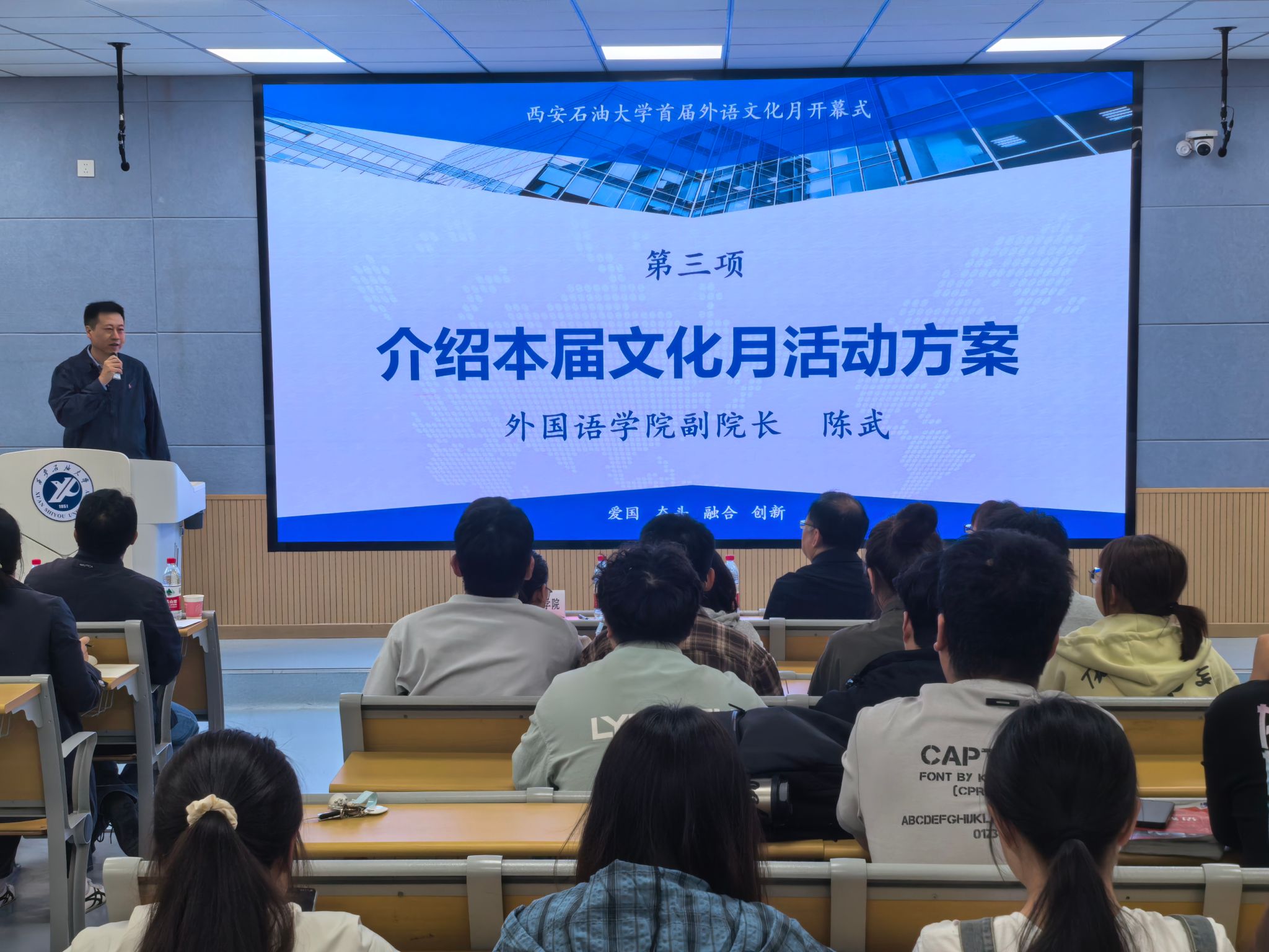 外国语学院副院长陈武介绍了首届外语文化月整体实施方案。他围绕活动总体定位、模块体系设计、品牌活动体系建设及预期成果等方面进行了系统介绍。本届外语文化月以“语言赋能未来·文化连接世界”为主题,着力构建覆盖全校、多维协同、特色鲜明的校园语言文化生态体系,通过五大模块协同推进语言能力提升、学科竞赛引领、能源特色实践和国际传播能力培养,构建全校协同参与的外语学习生态,营造良好校园语言文化氛围,助力能源特色国际化人才培养。