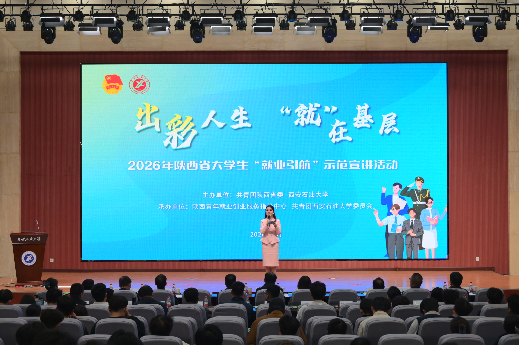 种宇宏代表学校致辞。他对共青团陕西省委长期以来关心支持学校青年就业创业工作表示感谢,向莅临现场的各位领导和嘉宾表示热烈欢迎。他指出,当前正值高校毕业生求职关键期,引导青年学生树立正确的择业观、就业观,到基层和祖国最需要的地方建功立业,具有十分重要的现实意义。本次“出彩人生‘就’在基层”就业引航示范宣讲活动,正是落实立德树人根本任务、服务国家战略需求的重要举措。他强调,活动不仅为广大学子提供了思想“引航”,通过榜样亲身讲述,帮助同学们认识到基层同样是大有可为的广阔舞台;也为青年成长精准“赋能”,通过分享一线奋斗经验和实用技能,提升同学们服务基层、适应社会的能力;同时进一步畅通了人才向基层流动的渠道,推动实现更高质量和更充分就业。他勉励同学们珍惜学习机会,从榜样身上汲取奋进力量,传承石油精神、铁人精神、延安精神,将个人理想融入国家发展和民族复兴的伟大事业中,主动到基层和人民中去建功立业,让青春在服务基层、奉献祖国中绽放光彩。