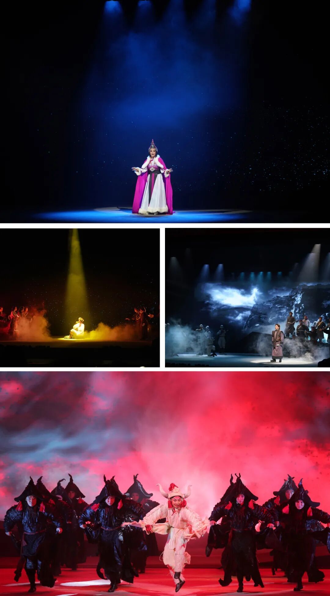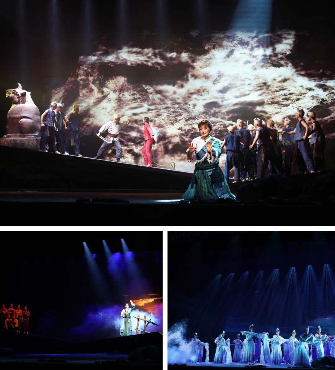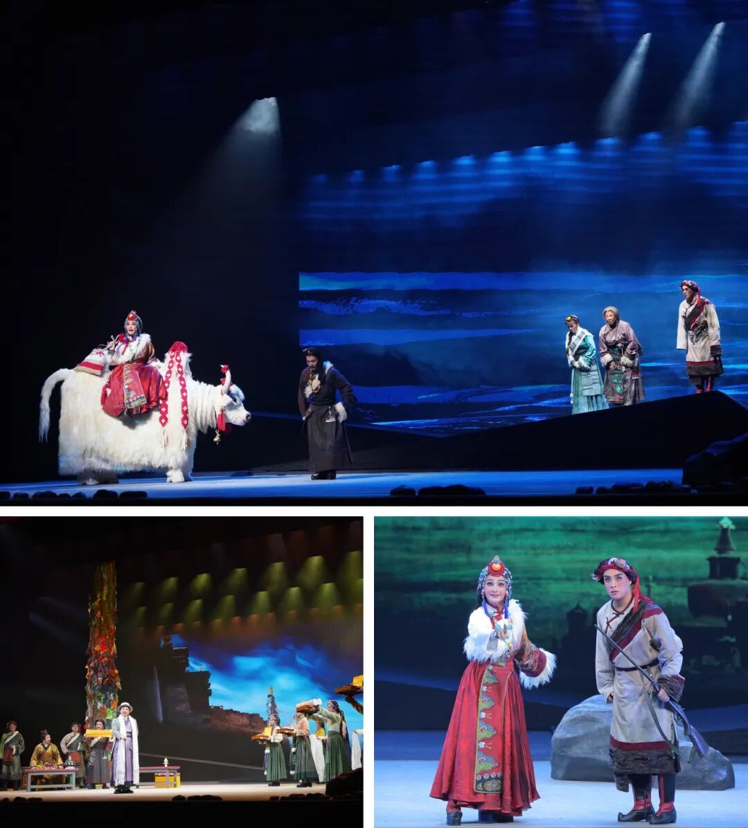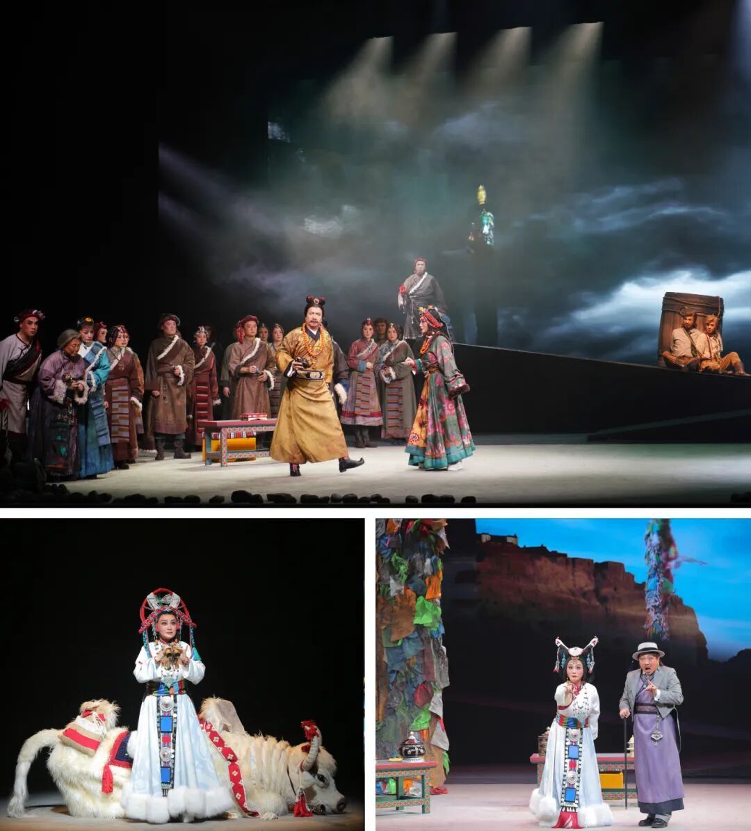 秦腔《红河谷》以藏族少女丹珠的人生轨迹为叙事主线,生动塑造出其果敢坚毅、舍生取义的鲜明人物形象。作品创新融合藏地音乐的辽阔曲风与秦腔艺术的铿锵唱腔,既勾勒出雪域高原的独特人文风貌,又彰显出秦腔雄浑苍劲的艺术气韵,极具艺术感染力,为在场师生呈现了一场兼具思想性与艺术性的文化盛宴。该剧采用“双主线并行、三重时空叠加”的亮眼舞台叙事设计:现实层面严格参照史料,还原藏军叉子枪、英军火炮等历史对峙细节;心理层面以丹珠亡灵视角追忆过往,借圣湖幻境等写意场景细腻描摹人物内心世界;象征层面通过白牦牛实体道具与全息雪山圣湖场景相互呼应,深刻阐释战争与和平的永恒命题。精巧的舞台架构,让观众在近三小时的沉浸式观演中,体悟历史的厚重感与舞台艺术的独特魅力。