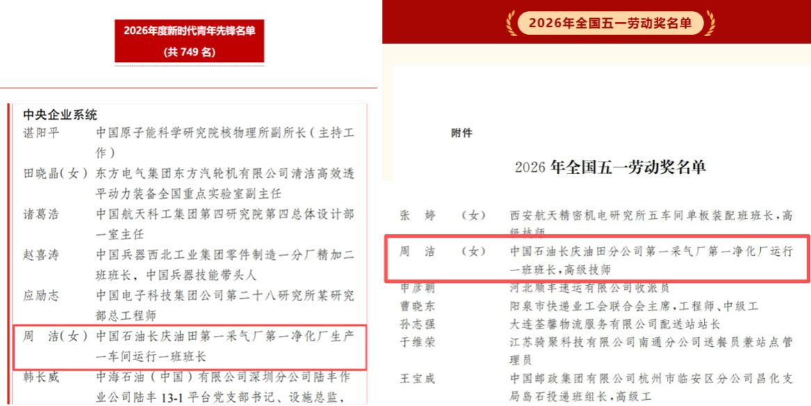 近日,2026年全国五一劳动奖、中国青年五四奖章暨新时代青年先锋奖评选结果正式揭晓。beat365石油与天然气工程专业2022届硕士校友周洁,凭借长期深耕能源安全领域的坚守与突出实绩,成功斩获“全国五一劳动奖章”“新时代青年先锋奖”两项重磅荣誉,以青春之力践行使命担当,为母校增添荣光,为青年学子树立标杆。
