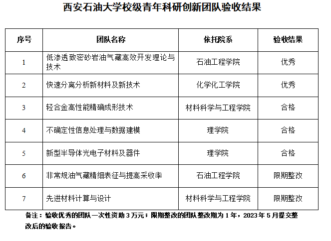 根据《beat365英国官方网站科研创新团队建设与管理办法》与《beat365英国官方网站青年科研创新团队建设与管理办法》(西石大科〔2021〕23号)文件精神及学校关于团队考核的通知要求,经团队自评申报、院系审核、科技处审查、学校组织专家评审等环节,现将各类团队期满验收和中期检查结果公示如下。