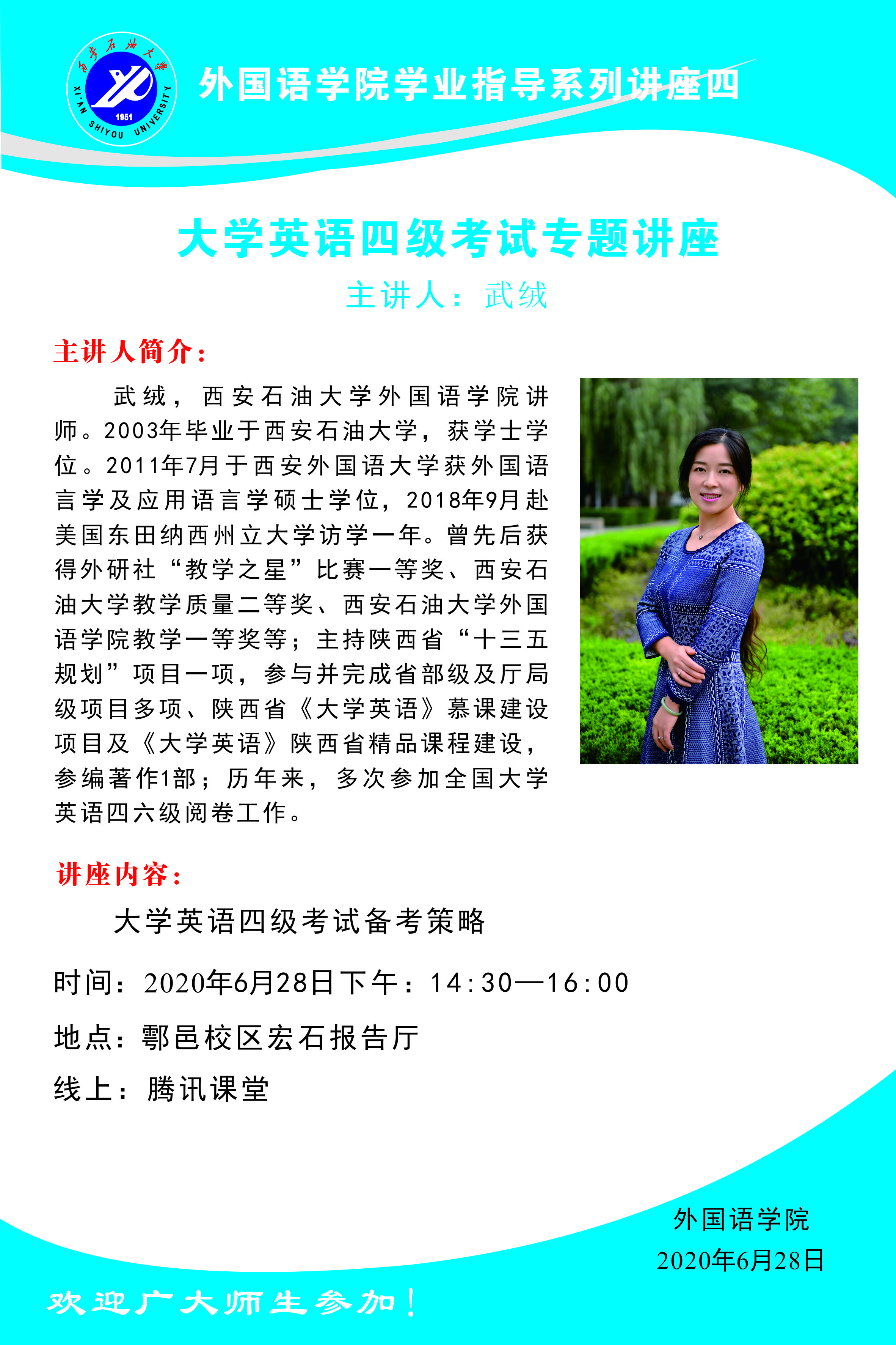 为提高beat365学生英语语言应用能力,提高大学英语四级通过率,外国语学院于2020年6月28日-7月9日和11月25日-12月9日分别举办大学英语四级讲座共计十三场,讲座由外国语学院优秀骨干教师担任主讲,分为听力、阅读、写作、翻译、应考策略、真题解析等板块。讲座内容包括大学英语四级考试的变化趋势、大学英语四级考试题型、出题规律及大学英语四级考试应试策略及注意事项。