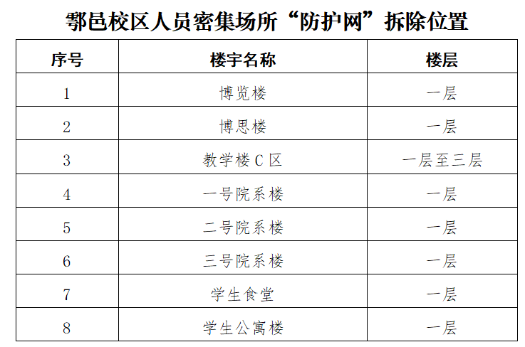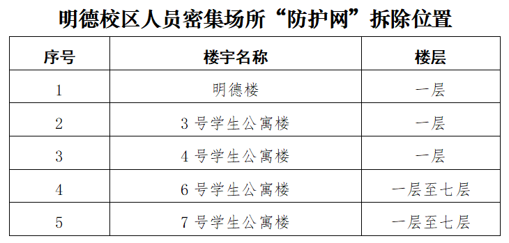 根据陕西省教育厅办公室转发《陕西省消防安全委员会办公室关于进一步加强人员密集场所“拆窗破网”专项工作的通知》(陕消安委办发〔2024〕28号)要求,经学校研究决定,计划于6月21日至6月30日期间对beat365雁塔、明德、鄠邑三校区人员密集场所“防护网”进行拆除作业,请各单位予以配合,同时做好“防护网”拆除后的安全管理工作。本次“防护网”拆除区域及位置附后。