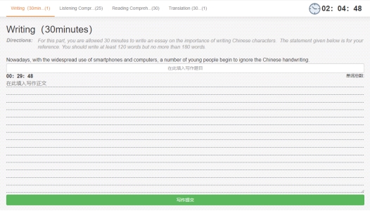 1、试卷一经提交即可获取测试成绩和参考答案,作文翻译由批改网系统智能批改评阅,如提交后没有翻译和写作成绩,是因当时瞬时分析任务过多在排队处理,请隔日再登录查询。