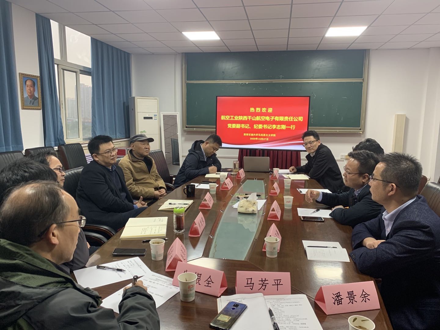 10月27日下午,航空工业陕西千山航空电子有限责任公司党委副书记、纪委书记李志刚一行四人来马克思主义学院交流座谈,就国企党建、项目实践、干部培训和研究生联合培养基地建设等方面进行走访调研。马克思主义学院党总支书记李渊、副院长张海涛、肖发荣及各教研室主任和教师代表参加了座谈会,会议由张海涛副院长主持。
