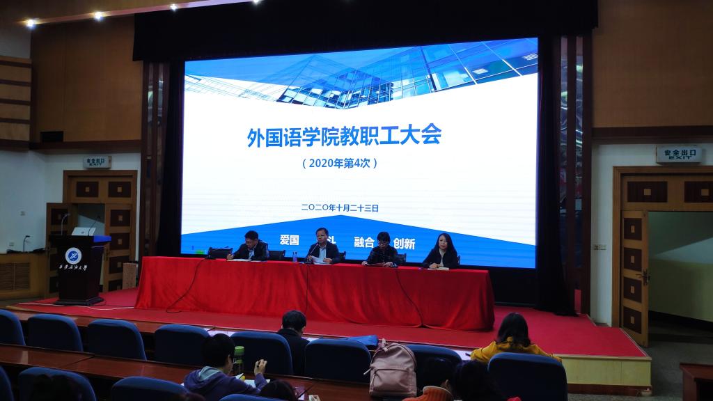 10月23日下午,外国语学院在雁塔校区学术报告厅召开全院教职工大会。全院教职工参加会议,会议由学院党委书记蔡强主持。