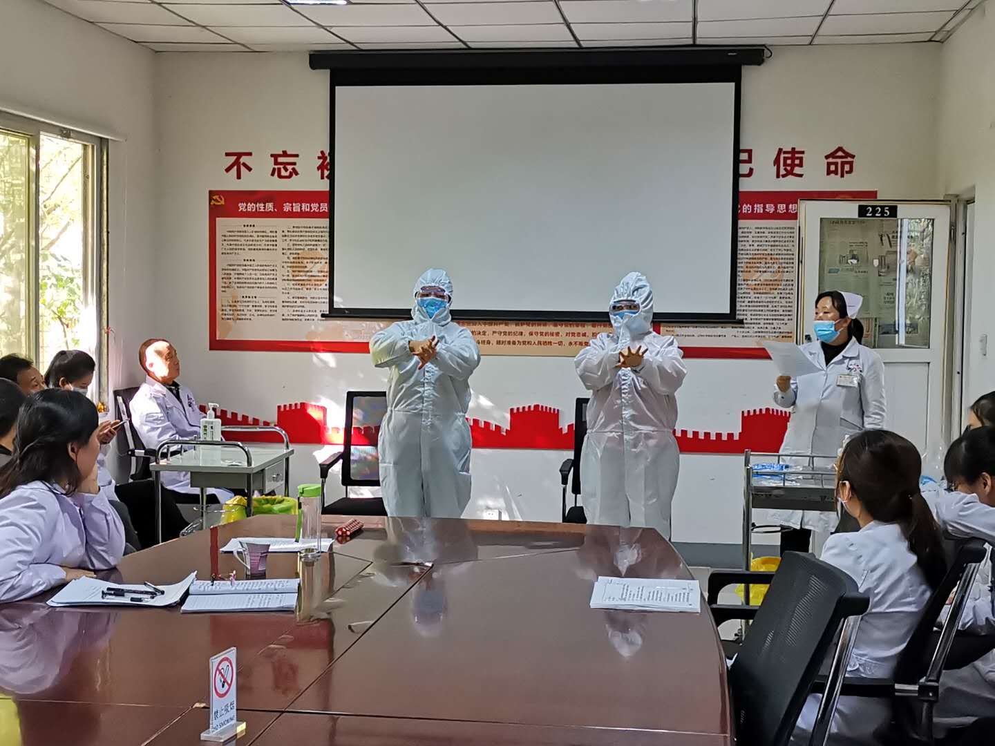 三、进行穿脱防护服演示及练习,由茹萍护士长负责讲解,两名工作人员示范手卫生和穿脱防护服的方法演示并手把手指导大家再次进行练习,通过练习和现场考核,大家能够熟练掌握穿脱隔离衣的技术,培训得到较好的效果。