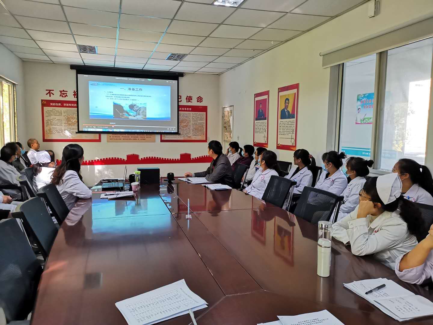 一、传达会议精神和理论知识培训,李明珠副院长传达了10月20日晚上雁塔区卫健局召开的关于《进一步加强全市医疗机构医院感染防控工作》会议精神和讲解了有关新冠肺炎诊疗方案(试行第八版)。崔广志院长根据会议要求,强调了医院感染管理地重要性,认真落实“九个一律”,安排部署好秋冬季疫情防控工作,特别强调了“九个一律”是红线、是底线,任何工作人员不得逾越!院感负责人伍晓燕讲解了医院的感染防护要求和标准,再次讲解了消毒液的配制要求和医疗废物的正确收集、处理。