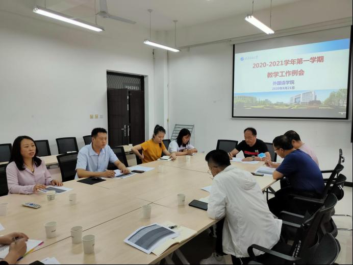 8月21日上午,外国语学院新学期教学工作会议在鄠邑校区人文经管楼314会议室召开。刘辉副院长、陈武副院长、各系部主任和教学办全体工作人员参加了会议。会议由陈武副院长主持。