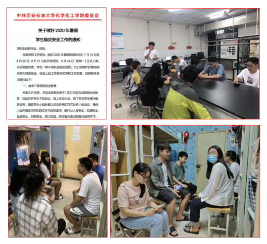 加强宣传教育和思想引导。根据学校工作安排,化学化工学院印发《关于做好2020年暑期学生稳定安全工作的通知》,进一步加强学生安全教育管理,强化预防,及时排查,安排值班,确保信息渠道畅通和各类突发事件处置及时有效处置。组织集中安全教育,包括召开学生干部会议,线上年级大会,线下留校学生班组、宿舍教育会等,开展以人身安全、交通安全、食品安全、财物安全、防火防盗、防诈骗为重点的安全教育学习,进一步普及安全常识,引导学生增强安全意识,提高安全防范能力,自觉遵守各项安全管理规章制度,确保返乡途中和社会实践过程中的安全。对于留校学生,建立了7个虚拟班级43个小组,落实每日健康监测和在校晚点名制度,对于离校学生,落实“一人一档”信息台账,及时告知离校注意事项和暑期居家疫情防控要求。7月22日以来,新疆出现新冠疫情反复和西藏那曲发生地震后,学院第一时间与返乡学生进行联系,逐一排查确定学生安全,统计受灾受损情况。