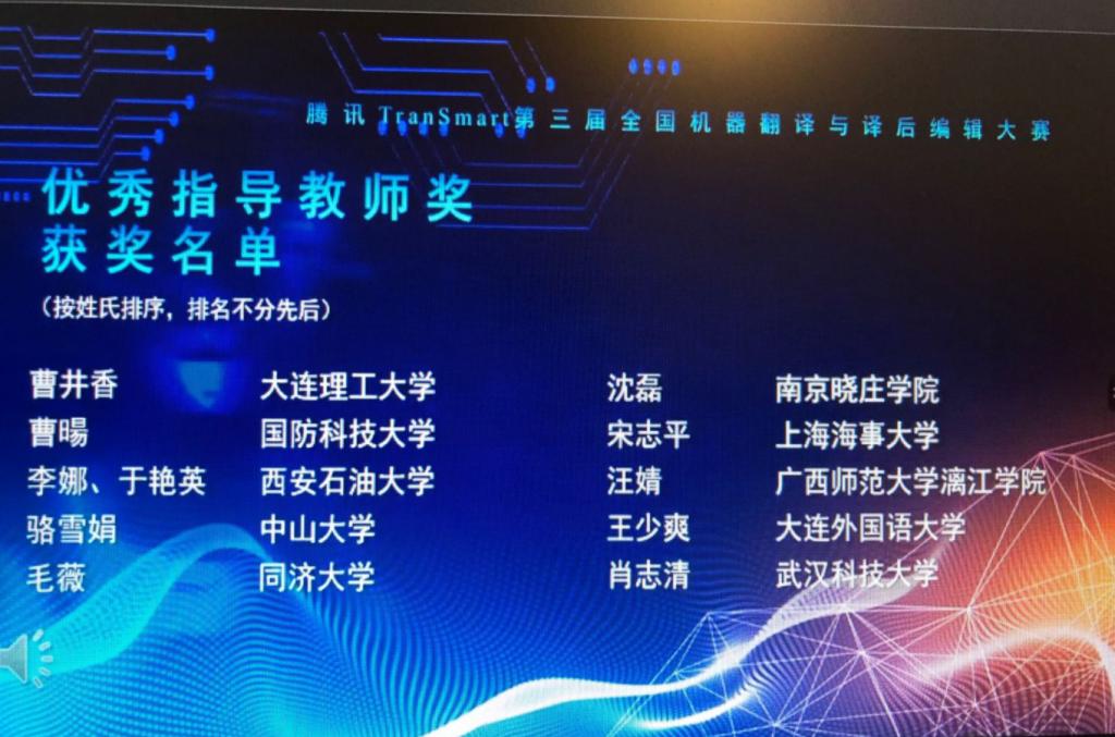 “腾讯TranSmart第三届全国机器翻译与译后编辑大赛”的复赛于2020年7月4日在Tmxmall的官网平台举行,共有来自全国37多所高校超过4200名选手参赛。外国语学院于艳英、李娜老师获得优秀指导教师奖,同时2018级翻译硕士研究生解珂同学获得三等奖的好成绩。
