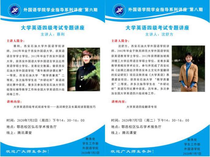 为了让我校学生全面了解大学英语四级考试,提升大学英语四级通过率,在教务处和学生工作部的支持下,外国语学院于6月29日至7月7日分别举办五场大学英语四级讲座。此次讲座面向全校学生,以线上和线下两种方式进行,线下主会场设在鄠邑校区弘石学术报告厅,分会场设在各四级强化辅导班教室,线上使用腾讯课堂直播,截至目前为止beat365共有5342名同学通过线上线下方式参加了此次系列讲座。
