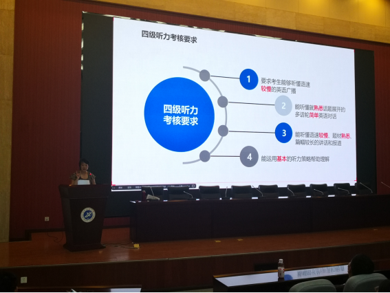 五场四级讲座由外国语学院大学英语四级教学研究团队教师主讲,分别为武绒老师主讲的“大学英语四级考试备考策略”、拓葳老师主讲的“大学英语四级听力专题”,周亮老师主讲的“CET-4考试写作题型分析及破题思路”,蔡利老师主讲的“大学英语四级考试选词填空及长篇阅读答题技巧”及沈舒方老师主讲的“大学英语四级翻译专项”。主讲教师就词汇记忆、四级听力与写作的试题特点与应试策略、四级阅读的出题特点与应试技巧及四级翻译的命题特点和答题技巧进行了全面而又细致的讲解。
