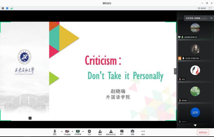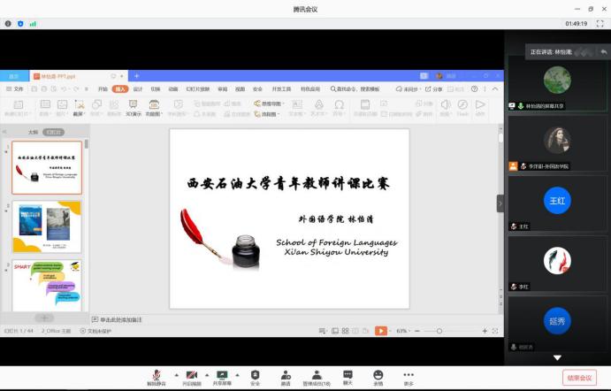 在经验分享环节,袁森教授指出教学既是科学也是艺术;祖延秀老师提出比赛与上课不同的观点,并根据外语专业的特点强调比赛不在于内容的深浅难易,在于让听的人明白;李红老师从线上比赛的角度出发,提出制作PPT的重要性,强调PPT制作要呈现目标,吸引眼球;秦艳霞老师强调线上讲课也要有激情,同时参赛老师们需要注重问题设计;李芳蕾老师在其他老师经验分享的基础上提出使用手写笔来体现板书,并加入课堂思政等方面的内容;最后陈旭老师从小语种专业的角度来给出有深度并且具有实用性的建议。