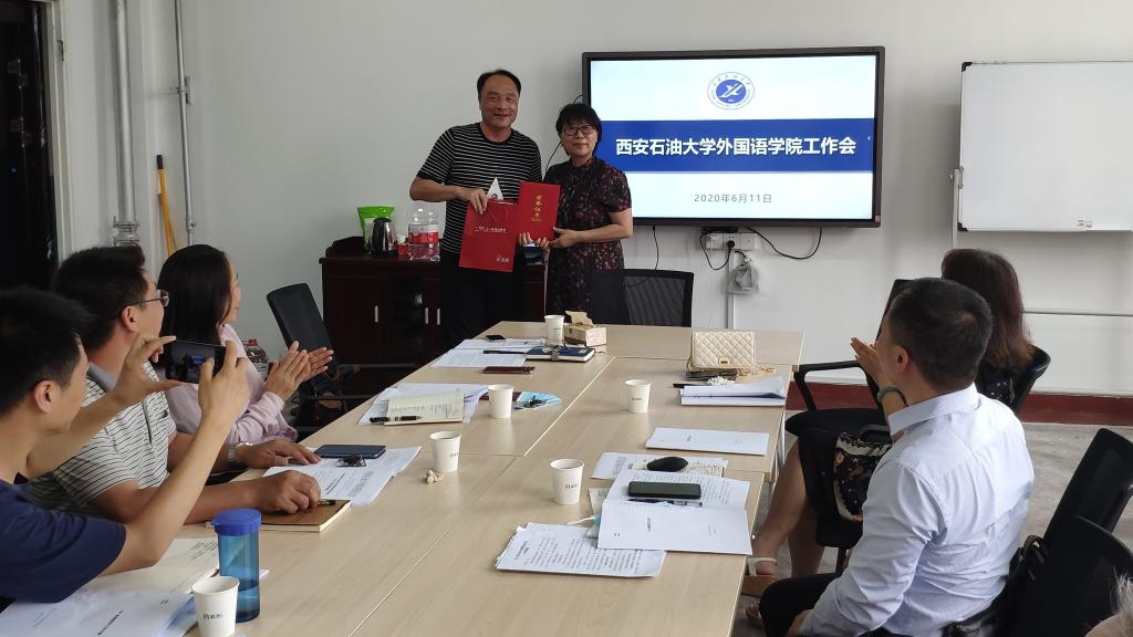 会上,对获得学校2019年度招生宣传先进个人的英语系主任钟泽波老师进行了表彰,宣布了学院党委关于研究生外语教学部和大学生外语第一教学部的干部任免通知。还就常态化疫情防控和线上线下教学工作、毕业生论文答辩和毕业审核工作、研究生复试、学生返校、学生日常管理 、毕业生就业等工作进行了强调和安排。