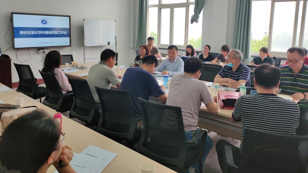 2020年6月11日下午,外国语学院在雁塔校区1#教学主楼706室召开了学院工作会。学院党委委员、党政领导、综合办主任、学生管理办公室主任、教工党支部书记和各系(部)、中心主任及教师代表参加了会议,会议由学院党委书记蔡强主持。