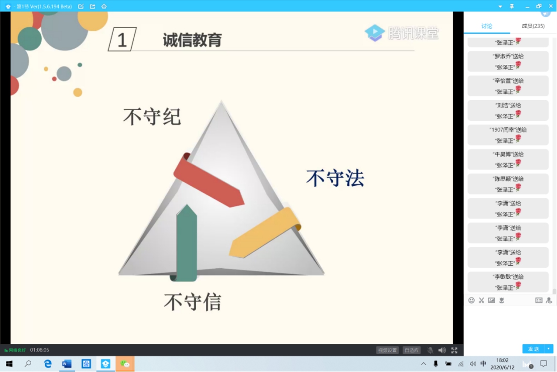 为进一步加强学生工作事务管理、推进校风班风建设、更好的为学生服务,2020年6月12日下午,人文学院2018级、2019级年级大会于不同时间在腾讯课堂平台线上召开,人文学院党委副书记盛丹、2018级辅导员范嘉欣、2019级辅导员张泽正及2018级、2019级全体同学参加会议。