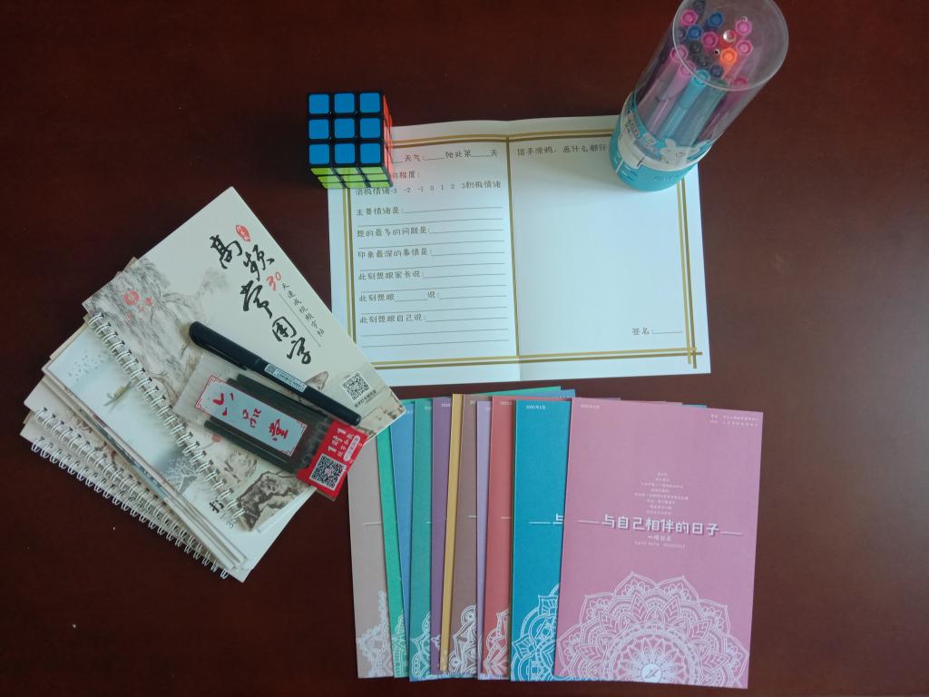 “独处时光·有爱相伴六件套”是油缘心理老师特意为学生挑选的6种减压益智的小工具,包括:察觉自我的心情日志手卡、砺心练脑的魔方、安心静心的字帖、强身健体的呼啦圈、见证成长的种子罐头、专业陪伴的心理援助平台。“与自己相伴的日子”心情日志手卡,由学生心理成长指导中心策划,人文学院文创中心精心设计,以含有beat365英国官方网站元素的14种颜色的14个曼陀罗手卡代表隔离的14天,让学生每天觉察自己的情绪、书写自己的心声、涂鸦自己的潜意识。在曼陀罗手卡的背景上,贴心送上油缘心理小建议,帮助学生在特殊的时期里好好爱自己。