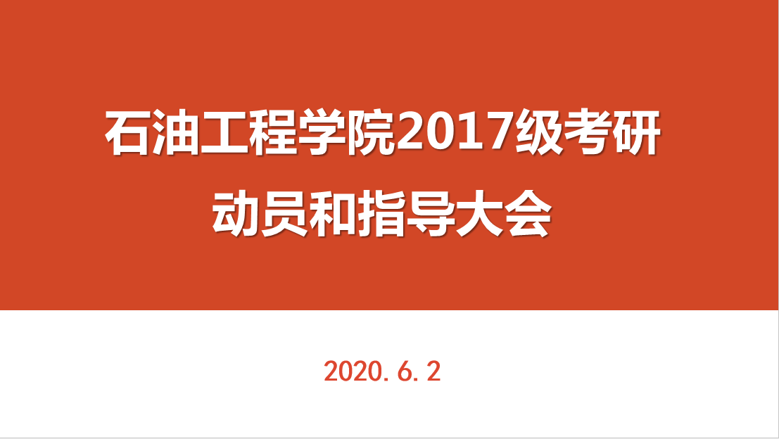 为进一步提高考研积极性,增进学生对考研的了解,挖掘自身潜能,石油工程学院于6月2日下午2点召开2017级考研动员和指导大会。院长周德胜、党委副书记张建高、副院长刘志坤、学工办主任朱战威、研究生教学管理负责老师王小香和2016级考研学生代表出席本次会议,2017级有考研意愿同学参加本次大会,会议由2017级辅导员孙浩哲主持。