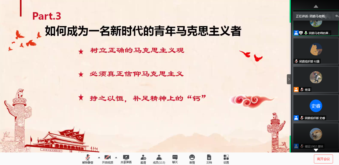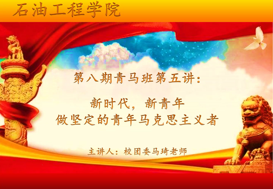 为进一步提升青年学生的理论修养,强化理想信念,5月29日下午石油工程学院第八期初级青马班第五讲顺利开展。校团委马琦老师受邀为全体参训学员讲授了题为“新时代,新青年,做坚定的青年马克思主义者”的线上培训,我院2019级120余名学生干部参加了此次培训活动。