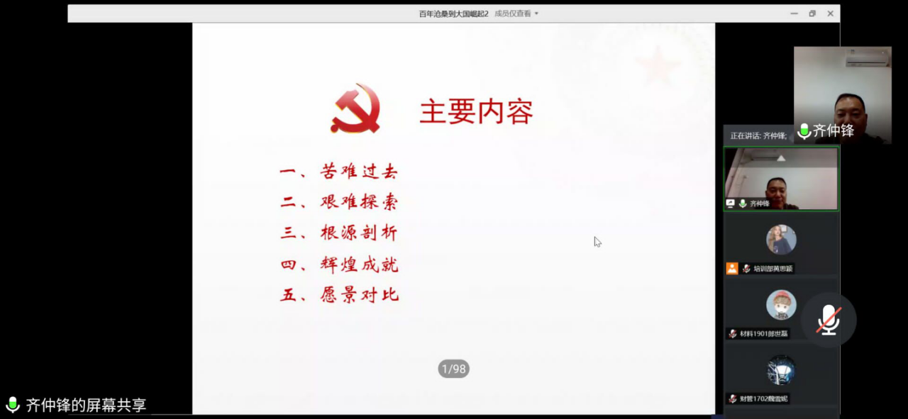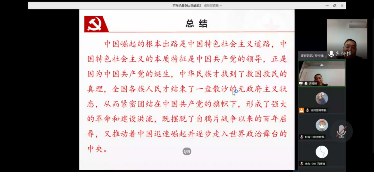 齐书记的讲授内容以时间为主线共分为五个部分。在“苦难过去”部分,他从四场主要战争的失败和失败后签订的不平等条约讲起,和大家一起回忆那段屈辱的历史;在“艰难探索”部分,齐书记主要讲述了从太平天国运动到中国共产党的诞生这一段曲折的探索时期,并重点讲述了中国共产党长达六十年的艰难成长史;在“根源剖析”部分,他给大家详细剖析了前期探索未能成功的原因和中国共产党“创业”成功的原因”;在“辉煌成就”部分,齐书记为我们详细列举了建国三十年和改革开放四十年来我国卓越的成就;而在“愿景对比”部分,他从“一百年前的国人梦”切入,与“一百年后的中国梦”进行对比,引导大家领略中国的进步之大,发展之快。最后,齐书记对本堂课作全面总结,并希望大家能够继续努力,争取早日入党!