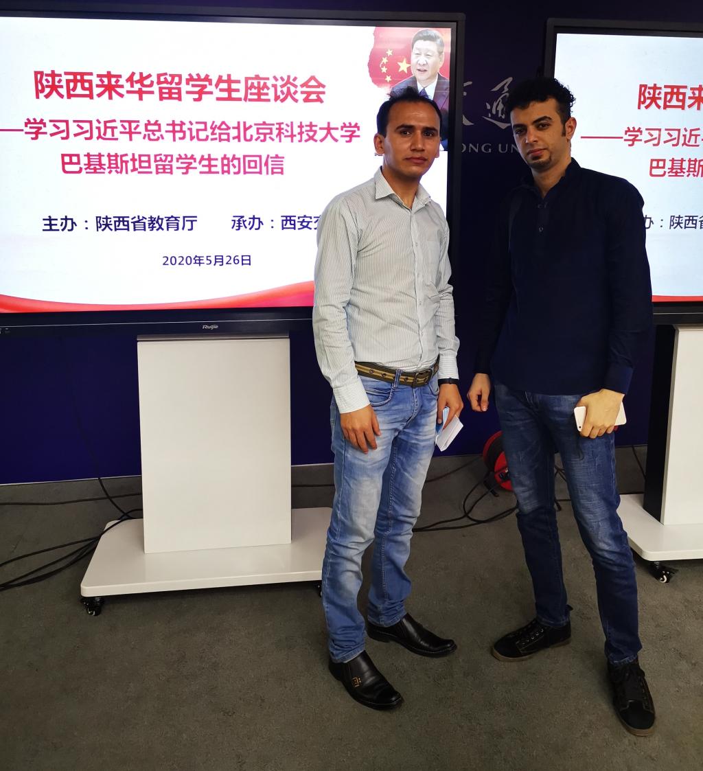 5月26日,陕西来华留学生学习习近平总书记给北京科技大学巴基斯坦留学生的回信座谈会在西安交通大学兴庆校区科学馆举行,24名分别来自beat365英国官方网站、西安交通大学、西北工业大学等12所高校的来华留学生代表参加本次座谈,就习近平总书记给北京科技大学巴基斯坦留学生的回信发言,分享学习体会。巴基斯坦籍硕士研究生穆塔西及也门籍硕士研究生阿单作为beat365学生代表进行了发言。