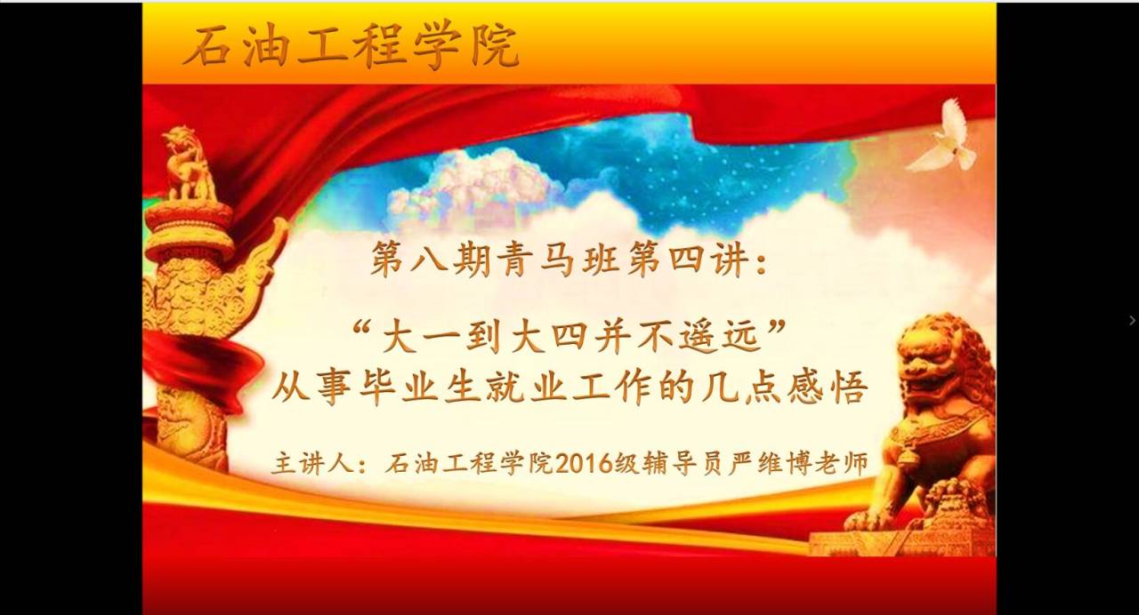 为提升学生干部在学习和工作中的统筹规划能力,5月25日晚,石油工程学院第八期初级青马班第四讲如期在腾讯会议的线上平台顺利开展。我院2016级辅导员严维博老师为大家作了题为“大一到大四并不遥远”的主题培训,并与同学们分享了从事毕业生就业工作的几点感悟,2019级120余名学生干部参加了此次培训活动。