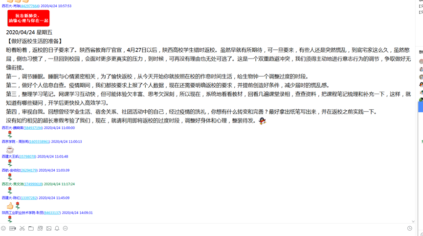 撰写“两封书信”,倾情守护凝心聚力。1月31日,学校发出《给湖北籍西石大学子的一封信》,向身处疫区中心的学生送去母校的牵挂与抚慰,与湖北籍学生及家人一起抗疫。2月6日,发布《给陕西高校班级心理委员的倡议书》,并通过陕西省委教育工作委员会转发全省各高校,鼓励广大学生骨干充分发挥朋辈优势,携手互助,建立战“疫”情境中的心理互助,在国家危机时洋溢青春的力量。