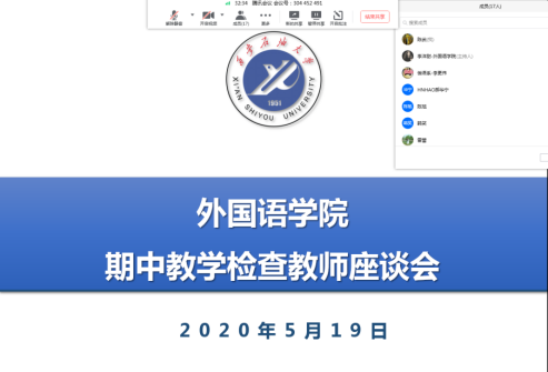 为迎接学校期中教学检查,外国语学院于2020年5月19日下午通过腾讯会议平台举行了期中教学检查线上教师座谈会。外国语学院教学副院长陈武主持召开了此次会议,校督导组组长郝华宁,校督导张倩霞、朱银泉、刘绍东、王新建以及外国语学院各系部主任和教师代表、教学办相关人员参加了此次座谈会。