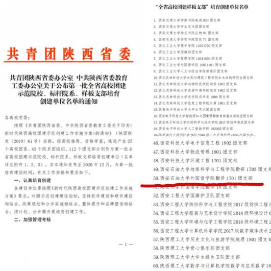 近日,共青团陕西省委、中共陕西省委教育工委联合下发《关于公布第一批全省高校团建示范院校、标杆院系、样板支部培育创建单位名单的通知》,外国语学院翻译1701团支部入选成为第一批“全省高校团建样板支部”培育创建单位。