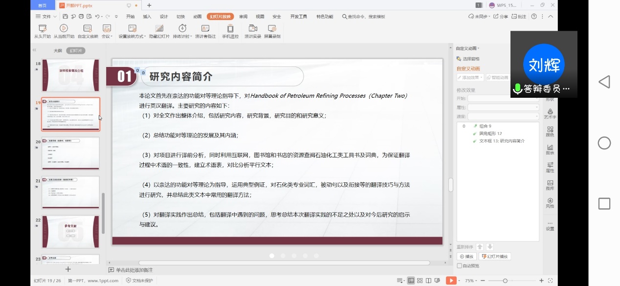 研究生学位论文开题是完成学位论文工作的基础,是保证学位论文质量的重要环节,为保证研究生培养质量和研究生学位论文水平,外国语学院依据研究生院《硕士学位论文开题管理补充规定》制定了2018级翻译硕士研究生二次开题工作细则,并于4月3日上午,使用线上平台(腾讯会议)进行了2018级翻译硕士研究生二次开题答辩会。答辩小组包括组长袁森教授,答辩委员刘辉教授和秦艳霞副教授,共有9名翻译硕士研究生参加答辩。