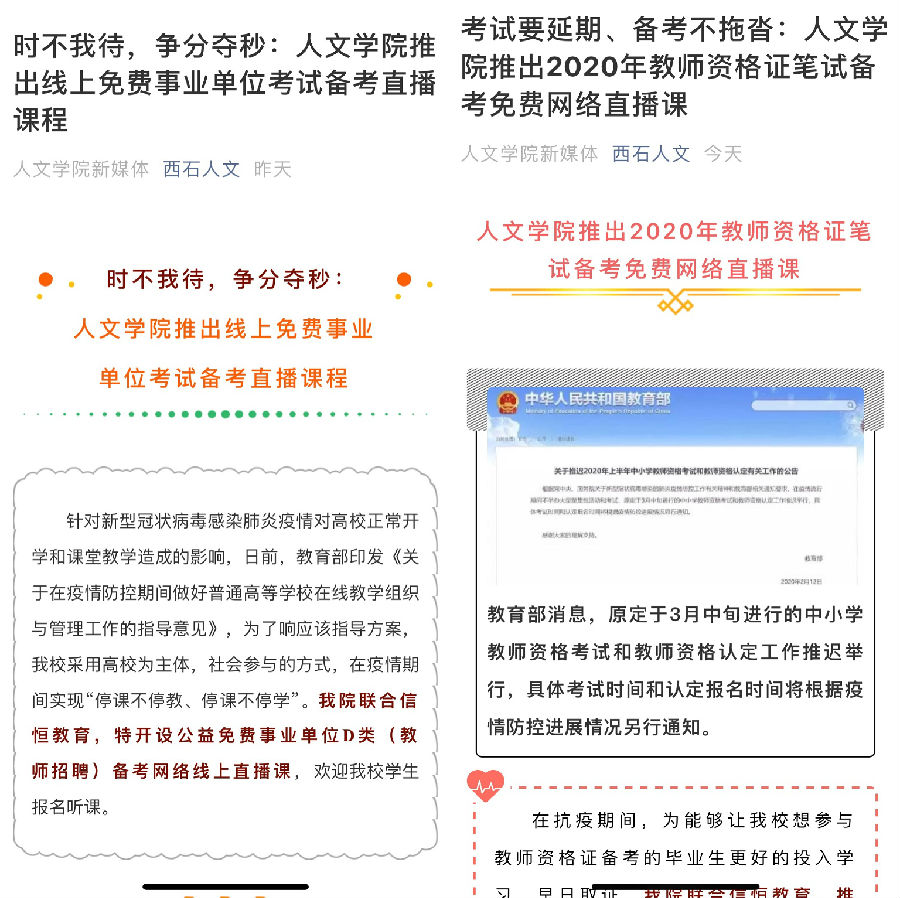 第二,课程辅导,安心备考。因疫情影响,国家各类型大型考试均延期举行,这为广大备考学生提供了充分的复习时间。为了能够让报考教师资格证考试和准备参加事业单位考试的学生更好投入学习,实现“停课不停教、停课不停学”,人文学院联合信恒教育,推出了线上免费事业单位考试备考和教师资格证笔试备考的辅导课程。课程从2月17日起由线上播出、周期为一个月,充分引导学生在疫情防控阶段合理规划个人时间、积极学习、安心备考。