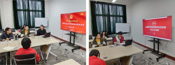 大学外语教学一部党支部书记葛丽、大学外语教学二部党支部副书记毕莹、英语系教师党支部书记陈武、俄语系教师党支部书记孙婷、翻译系党支部书记高鹏鹏和英语系学生党支部书记张帆围绕学校党支部工作标准和评价指标体系,聚焦“七个有力”,重点就党支部“不忘初心、牢记使命”主题教育、“两学一做”学习教育常态化制度化、 “三会一课”、在教学科研工作战斗堡垒作用和党员先锋模范作用发挥情况等进行了汇报。