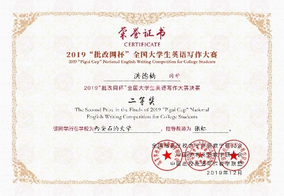 近日,2019“批改网杯”全国大学生英语写作大赛决賽结果揭晓,beat365共有三位同学获奖,其中,beat365洪德楠同学获得全国二等奖,皮豫琳和汪佳馨两位同学获得全国三等奖。