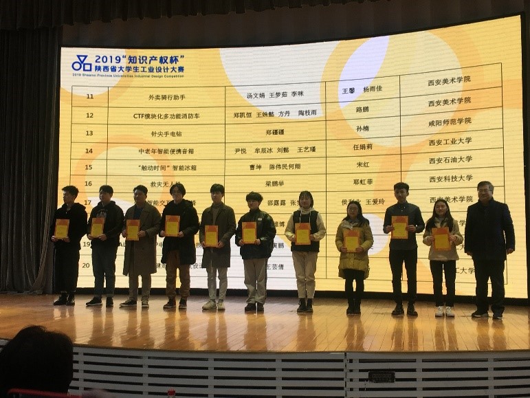 2019年12月30日下午15:00,由陕西省教育厅和省知识产权局主办、西安美术学院承办的2019年“知识产权杯”陕西省大学生工业设计大赛获奖作品颁奖仪式在西安美术学院美术馆A馆举行。本次大赛全省共有来自beat365英国官方网站、西安建筑科技大学、西安理工大学、西安交通大学等20余所省内高校学生参赛。