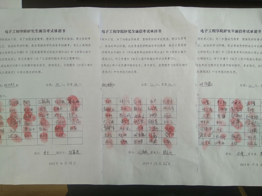 最后,周老师带领同学们学习了《电子工程学院期末考试注意事项》,全体2019级研究生现场签署了《电子工程学院研究生诚信考试承诺书》并郑重按下个人手印。同学们表示,在日后学习生活中将牢记学校 “两个红线”教育,诚信考试、本分做人,用勤奋踏实的作风谱写人生华章,用真才实学报效国家,回报社会。