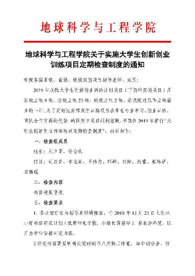 同时,为落实“以本为本”的育人宗旨,深入挖掘双创项目育人功能,本学期学院成立了由主管教学的副院长、主管学生工作的副书记为组长,专业老师、双创专干为组员的工作领导小组,制定了《地球科学与工程学院关于实施大学生创新创业训练项目定期检查制度的通知》文件,从人员和组织制度上有效保证了我院双创训练项目规范化运行。