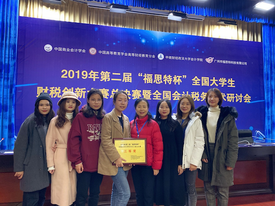 2019年12月14日,由中国商业会计协会主办,中南财经政法大学会计学院大学承办的2019年第二届“福思特杯”全国大学生财税创新大赛总决赛在中南财经政法大学落下帷幕。由经济管理学院聂亦慧老师指导,刘方迪、吴迪、杨晨卓、黄娣、林穗佳五位同学组成的参赛团队,顺利跻身最终决赛并获三等奖。