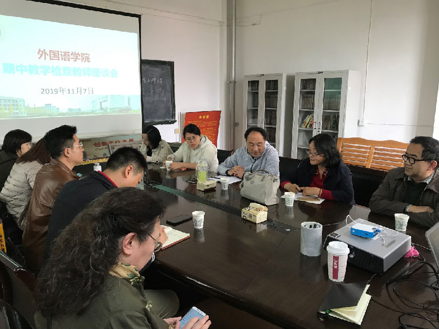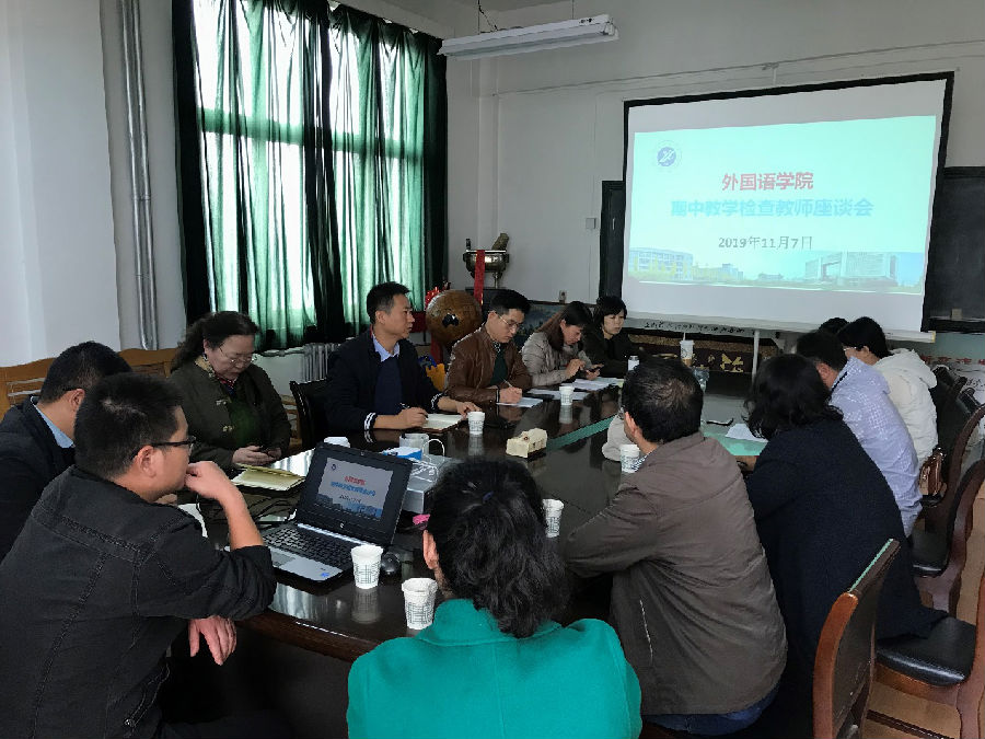 外国语学院于2019年11月7日下午在雁塔校区一号教学楼701会议室举行了期中教学检查教师座谈会。外国语学院教学副院长陈武主持召开了此次会议,校督导张倩霞、外国语学院英语系主任钟泽波、翻译系副主任秦艳霞、俄语系副主任李更伟、公共外语第一教学部主任葛丽、公共外语第二教学部主任彭健、教学秘书刘喜军、李洋甜及外国语学院各系部教师代表参加了此次座谈会。
