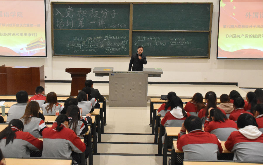 11月3日晚,外国语学院在鄠邑校区石工地科楼115教室举行了第八期入党积极分子培训班开班仪式暨第一讲,学院党委书记蔡强、党委副书记王业青以及95名入党积极分子参加了培训。培训会由学院专职组织员、翻译系学生党支部书记白鹭主持。
