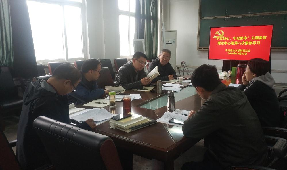 2019年10月25日上午,马克思主义学院党总支理论学习中心组举行 “不忘初心、牢记使命”主题教育第八次集体学习暨“奋进有位抓落实”专题研讨。学习研讨会议由党总支书记李渊主持,学院党政领导班子、理论中心组成员、教工党支部书记及教研室主任参加。