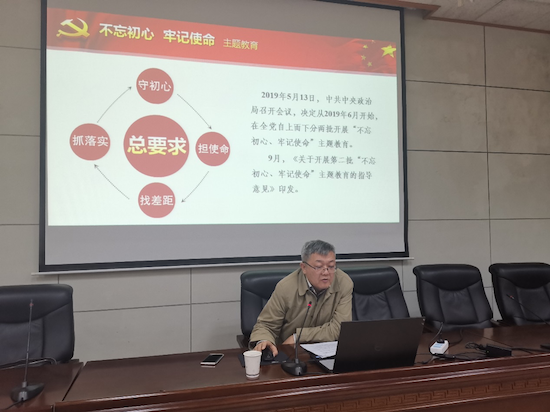 闫书记首先对“不忘初心、牢记使命”主题教育做了简介。他指出,“不忘初心、牢记使命”主题教育是在全党范围内开展的主题教育,是推动全党更加自觉地为实现新时代党的历史使命不懈奋斗的重要内容。2019年5月13日, 中共中央政治局召开会议,决定从2019年6月开始,在全党自上而下分两批开展“不忘初心、牢记使命”主题教育。9月,《关于开展第二批“不忘初心、牢记使命”主题教育的指导意见》印发。本次主题教育的总要求为守初心、担使命,找差距、抓落实,根本任务是牢牢把握深入学习贯彻习近平新时代中国特色社会主义思想、锤炼忠诚干净担当的政治品格、团结带领全国各族人民为实现伟大梦想共同奋斗,具体目标包括理论学习有收获,思想政治受洗礼,干事创业敢担当,为民服务解难题,清正廉洁作表率。