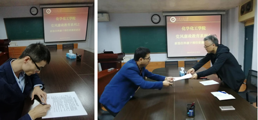 四是开展新提任科级领导干部廉洁谈话教育。为进一步提高新提任科级干部对党风廉政建设重要性认识,增强廉洁勤政意识,2019年9月25日上午,学院党委对新提任的2名科级干部进行了廉政谈话教育。学院党委书记司马文龙从三个方面提出了具体要求,一是信念过硬,提高思想境界,永葆本色;二是政治过硬,加强学习,踏实做事;三是作风过硬,廉洁自律,以身作则。学院2位新任科级干部从依法行政、秉公用权、廉洁自律角度逐一交流了认识和决心,并签订了“廉洁自律承诺书”。此次谈话教育,进一步明示了科级干部履职需遵照执行的党规党纪要求等刚性约束,又体现了组织对确保新提任人员履好职、起好步的关怀温度,进一步强化了新提任科级领导干部的依法行政意识和廉洁从政意识。