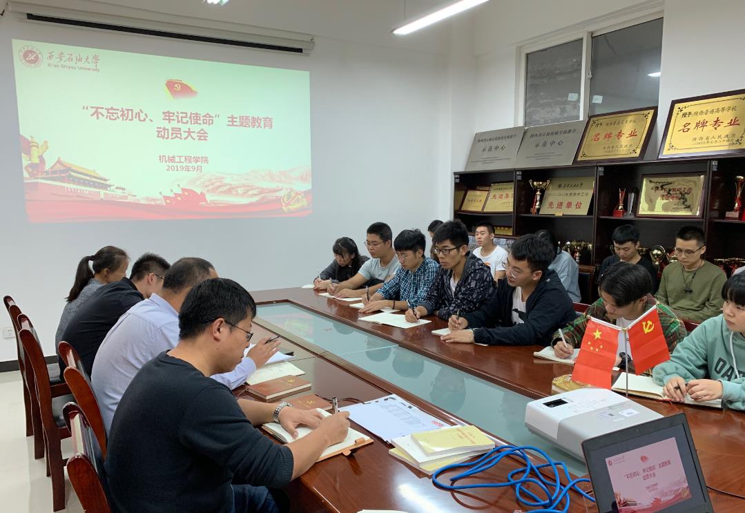 为推进“不忘初心、牢记使命”主题教育深入开展,9月20日下午,机械工程学院“不忘初心、牢记使命”主题教育学生党员动员部署会在雁塔校区和鄠邑校区同时召开。学生党支部书记、支部副书记、支部委员等参加会议,会议分别由学院党委书记田党宏和党委副书记刘笛主持。