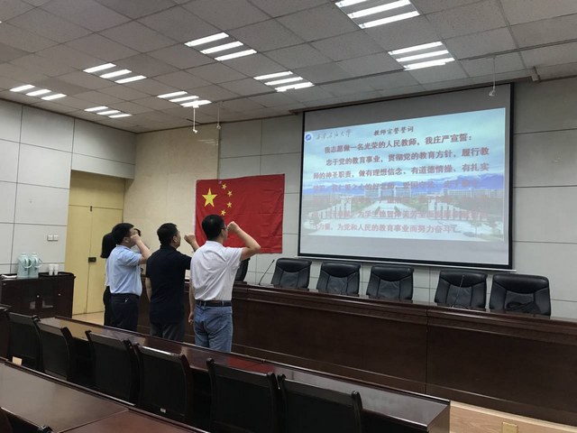 9月12日下午,理学院全体教职工着正装在第三会议室举行了庄严的教师宣誓仪式。宣誓仪式由院党党委书记廖敏主持。