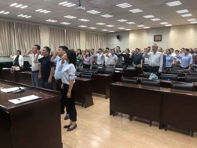 在廖敏书记的带领下下,全体教师面朝国旗庄严宣誓,“我志愿成为一名光荣的人民教师,忠诚党的教育事业,贯彻党的教育方针,履行教师的神圣职责......”。