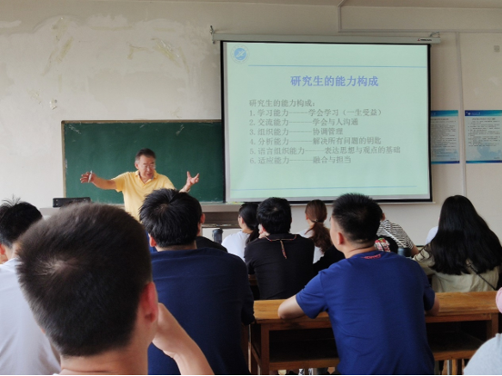 会议伊始,张家田教授对研究生新生的到来表示了欢迎,并以“浅谈研究生的知识构成与基本素质”为主题,结合自身经历从研究生的知识构成、能力构成、基本素质养成几个方面进行了深入的讲解。对我院研究生的日常学习生活提出三点要求;一、研究生的能力应该从学习、组织、语言、适应力等几方面全面发展,综合提升自身素质。二、研究生学习期间保持平衡心态,积极主动与老师交流学习生活状态。三、做人为做事之本,做事为要,做人为先。