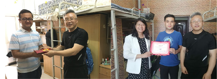 学院领导老师一行先后走访了学院化工、能化、应化、环境等各专业宿舍,受到了毕业生的热情欢迎,大家就毕业生在校近况、离校安排、就业去向及今后打算等进行了现场交流。听闻化工专业阿迪力·吾买尔主动投身西部计划,将赴南疆和田一线就业,应化专业杨佳晖志愿参军选择毕业入伍,司马书记对他们积极响应国家号召,志愿投身国防、扎根边疆给予高度评价,并送上了刻有专属姓名的原油印章毕业礼物,希望他们能扎根基层,积极进取,为服务祖国、服务地方做出自己应有的贡献。环境专业依布拉音同学在校期间积极参加各项民族团结教育活动,并在学院《祖国颂》庆祝建国70周年经典朗诵比赛荣获一等奖,司马书记和王院长现场为他颁发了获奖证书,鼓励他在走上工作岗位后,继续传承发扬石油精神和铁人精神,再创佳绩,回报母校。