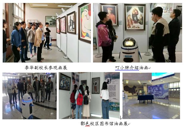 每幅参展的油画下方配有二维码,扫码后,同学们即可聆听作品音频讲解和同时期优美古典名曲。同时,我馆首次引进了智能机器人服务模式。机器人——叮小胖集自主交互、咨询查询、讲解宣传、引导提醒、智慧办公、休闲放松等多功能为一体,它不仅可以普及有趣的艺术知识,而且可以给予观众别致的艺术试听盛宴。本次“高雅艺术进校园——世界著名油画展”活动开阔了师生的审美视野和维度,培育了师生的艺术情操,获得了大家的一致好评。