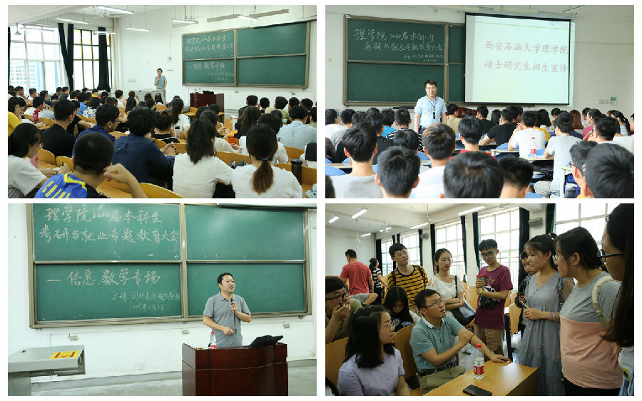 6月3日上午,学院在鄠邑校区B212教室召开了“数学类本科生考研与就业专题教育大会”。副院长折延宏教授从中美贸易问题入手,分析大学生就业、考研面临的现状,分析“数学类相关专业”的重要性和以数学算法为基础的大数据相关专业的发展前景。随后,折教授从考研学校的选择、考研专业的选择两个方面开展讲述,他鼓励同学们勇攀人生高峰,制定明确的考研计划。折教授还详细讲述了数学一级学理科和二级学科的相关专业,对于西安交大、西北工业大学数学类研究生招生专业、招生政策进行了详细介绍。最后,折教授还细致耐心的回答了同学们关于就业、考研、成长成才的一系列问题。